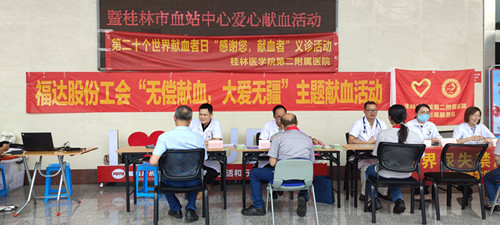 福達(dá)股份工會(huì)攜手桂林醫(yī)學(xué)院第二附屬醫(yī)院和桂林市血站中心開(kāi)展義診獻(xiàn)愛(ài)心·獻(xiàn)血傳真情活動(dòng)