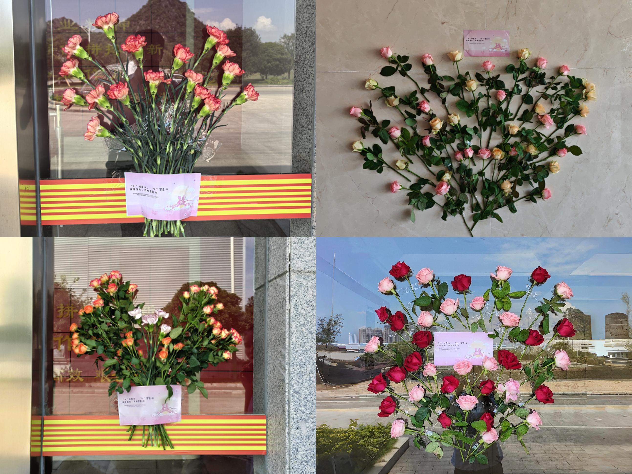 七夕清晨,公司工會早早組織工作人員在各辦公樓的玻璃門上精心布置玫瑰花束——別出心裁地拼出樹形、心形等多種生動造型。每一枝玫瑰花還附有溫馨的祝福語,靜靜等候員工的到來。